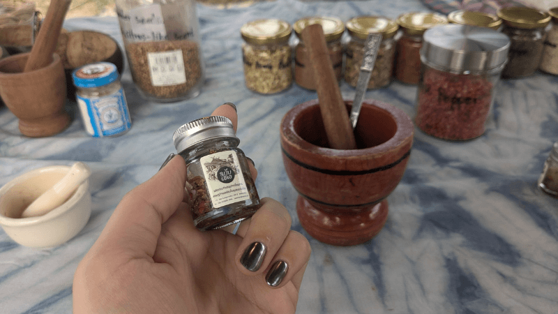 一番楽しくて役に立ったのはヤードム(ハーブのインへーラー・嗅ぎ薬)作り体験!マリファナ臭い、インド系の体臭がくさいステージでは片手に嗅ぎながら踊りました。眠気覚ましにもピッタリ!フェスに欠かせません(日本のフェスにも持って行っています)
