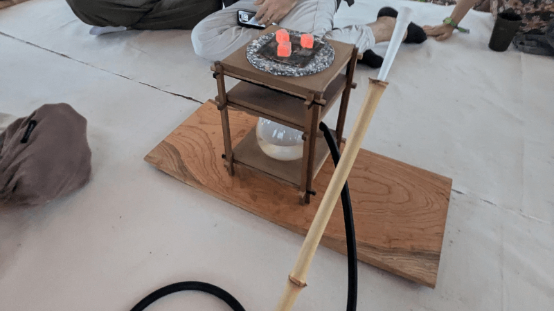 そしてまさかの京都で茶のシーシャ体験を提供しているOchillさんと再会。海外生活に茶の香りが沁みます。加熱された茶がほうじ茶の香りに変わっていくのもまた最高です。自然豊かな屋外での体験もまたいとをかしでした。